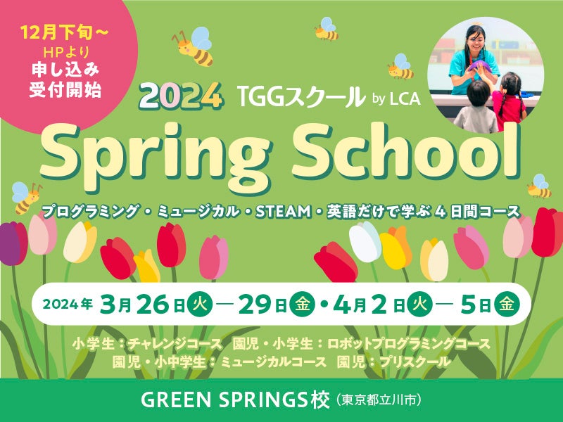 ロボットプログラミングやミュージカル、STEAM、課題解決型学習など、興味に合わせた楽しいコースで国内留学体験ができるTGGの「スプリングスクール」。TGGを構成するコンソーシアムの1社である株式会社エデューレエルシーエー(神奈川・相模原市緑区/代表取締役:山口紀生)が教室運営を担当。同社が運営する「LCA国際プリスクール・小学校」のアクティブイマージョン指導法を使い、さまざまなテーマを英語で学びながら、ディスカッションや作業を通じて英語学習と同時に特定分野の知識や思考を深めます。