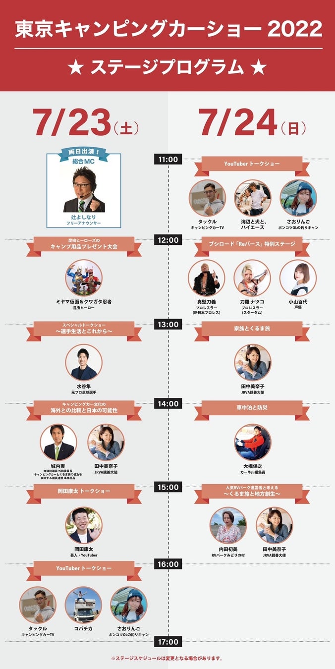 総合MCに辻よしなりさん迎え、東京オリンピックで金メダルを獲得した水谷隼さん、キャンピングカーとくるま旅の普及を実現する議員連盟事務局長を務める城内実さん、女優の田中美奈子さん、声優の小山百代さん、プロレスラーの真壁刀義さん(新日本プロレス)、刀羅ナツコさん(スターダム)、YouTube登録者数40万人以上の人気芸人・YouTuberの岡田康太さんなどによるトークショー等、豪華出演者達によるバラエティ溢れたステージを展開します。