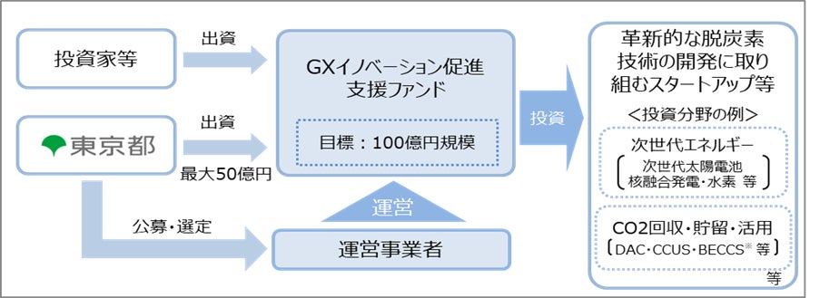 そこで都は、こうしたスタートアップ等への支援を通じた持続可能な社会の実現への貢献、民間企業と連携した新たな資金の流れの構築等を目指して、「GXイノベーション促進支援ファンド」を創設することとし、下記の通り、運営事業者を募集しますのでお知らせします。