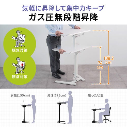 高さは74~108.2cmまで無段階で調整可能。ガス圧式を採用しているため、レバー操作ひとつでスムーズに昇降できます。座り作業からスタンディング作業への切り替えも簡単。長時間のデスクワークによる身体への負担軽減をサポートし、生産性向上にも貢献します。