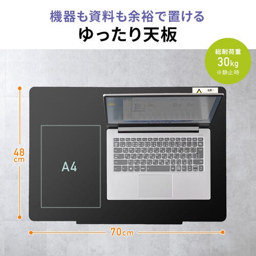 天板サイズはW70×D48cmで、ノートPCや資料をしっかり置ける広さを確保。耐荷重は30kgと安心設計です。エッジは丸みを持たせ、腕への当たりを軽減。表面には耐久性の高い塩ビシートを採用し、汚れにも強い仕様です。さらにバッグやヘッドホンを掛けられるフック付きで、デスク周りもすっきり整います。
