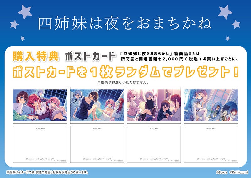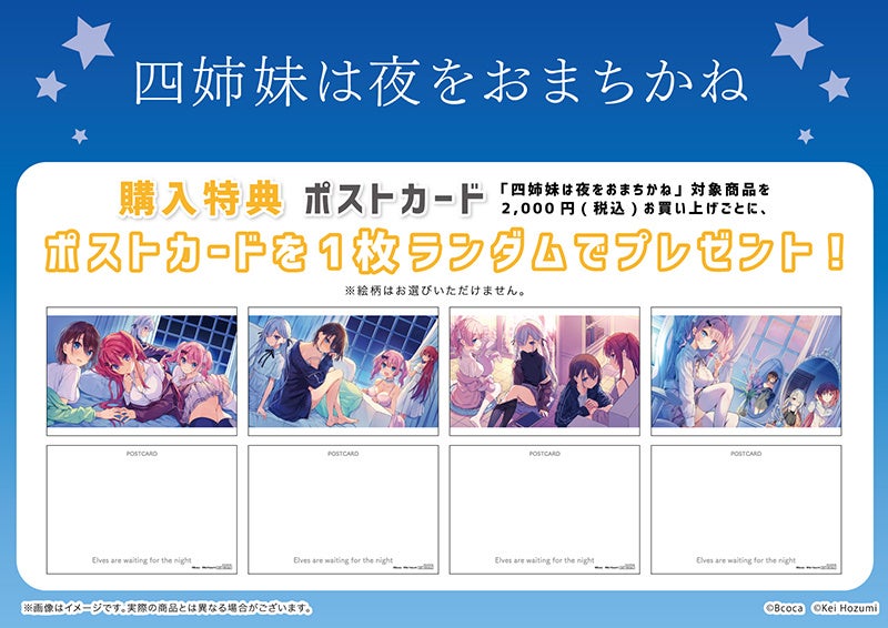 期間中、ゲーマーズオンラインショップにて『四姉妹は夜をおまちかね』【対象商品】を2,000円(税込)お買い上げごとに、特典ポストカード(全4種)をランダムで1枚プレゼント!