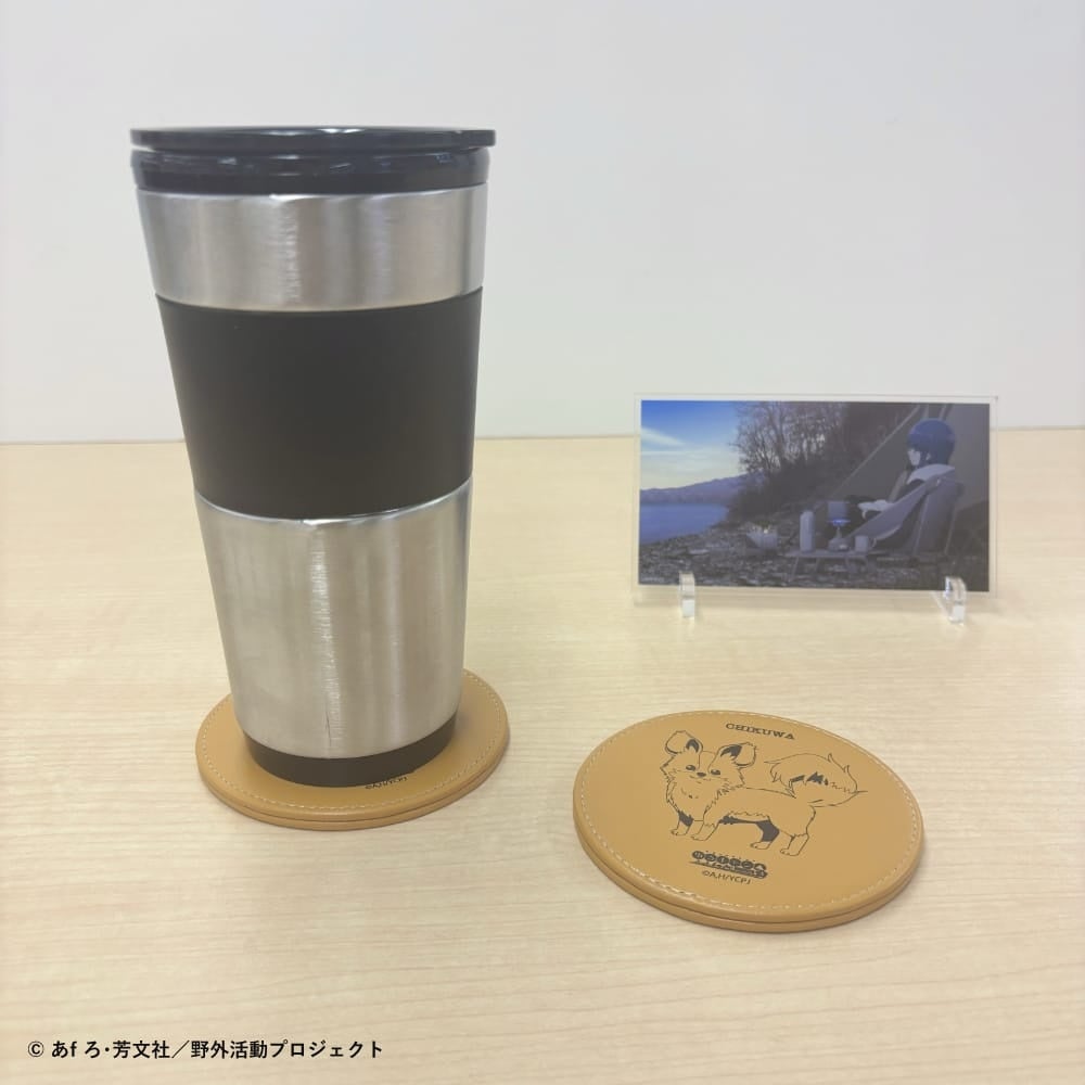 なるべく作中の美しいシーンをそのまま再現できるよう制作した「ミニアクリルパネル」や、キャラクターを中心にデザインした「缶バッジ」など盛りだくさん。中でもこだわったのは、『ちくわ』と『はんぺん』を焼き印風にプリントした、実際にキャンプでも使っていただける「レザーコースター」!