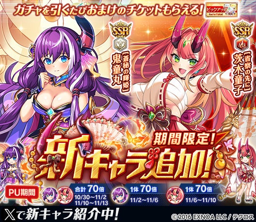 合同会社EXNOA(本社:東京都港区、CEO:東條 寛、URL:https://games.dmm.com/ )が運営するDMM GAMESにおいて『神姫PROJECT』は、「鬼童丸」「茨木童子」が新たな限定神姫として登場する事を発表した。さらに新たな期間限定イベント「大和鬼神絵巻 鬼哭啾々」を開催する。