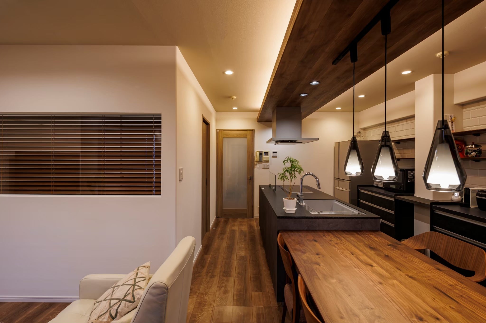 評価ポイント:キッチンから一直線に連続したダイニングテーブルが特徴的なアイランドキッチンにより、ダイナミックな空間へと変身。