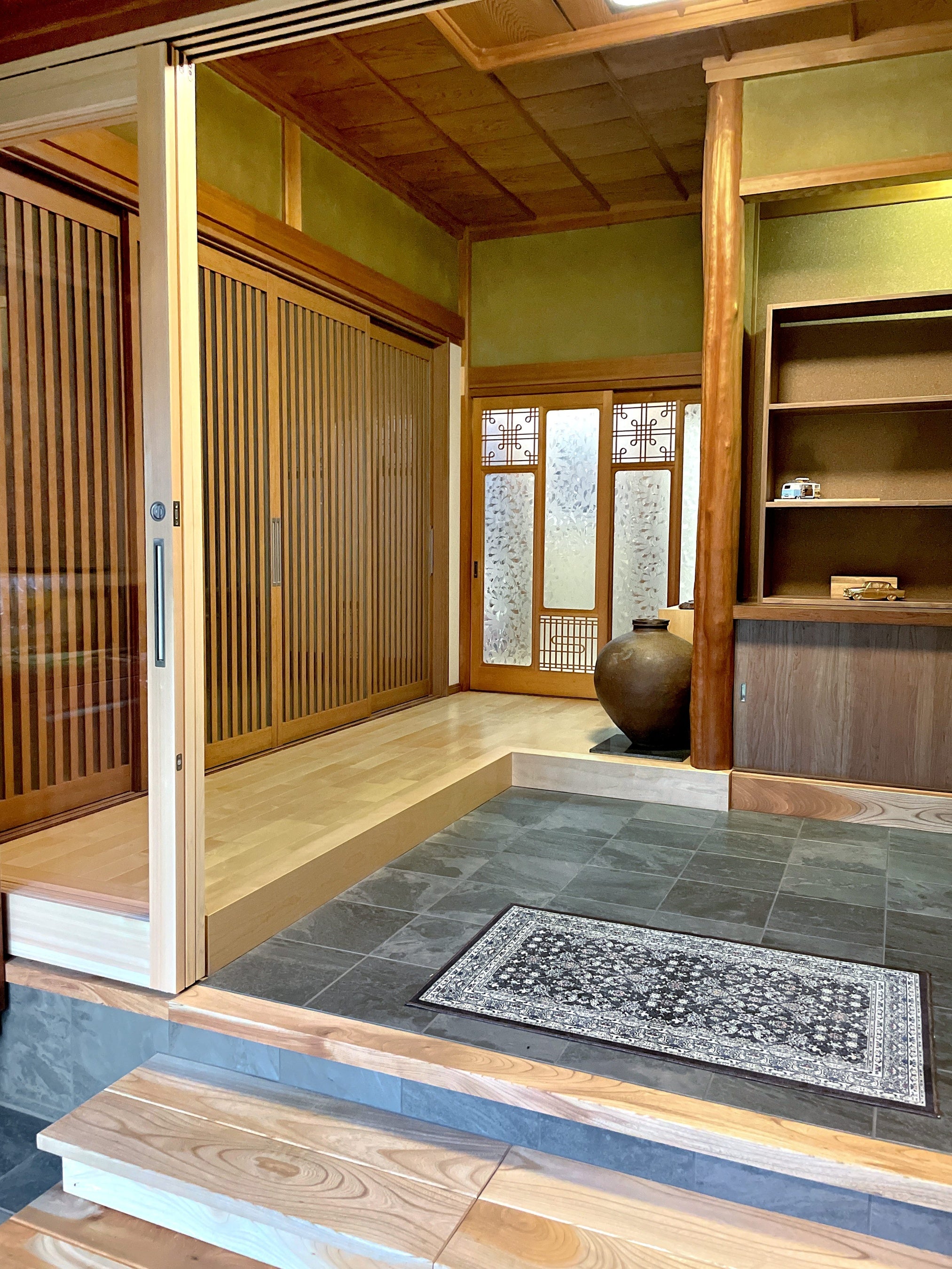 評価ポイント:既存の和の空間を活かしながら段差の位置を変えることで高齢化配慮と引き戸追加で断熱性、ペット配慮を実現。