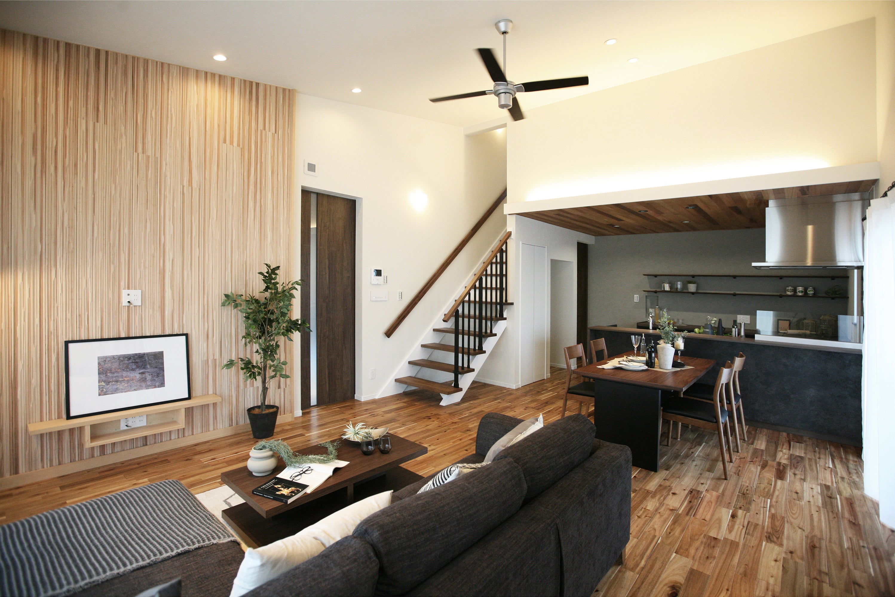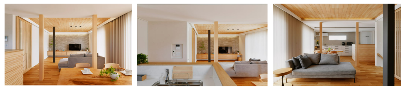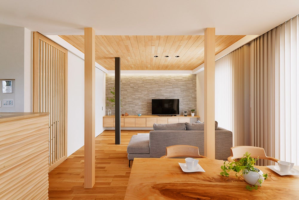 評価ポイント:勾配天井により広々と感じられるリビング。将来の家族構成の変化や収納設計、素材の選定、ディテールまでしっかりと考慮された住まい。
