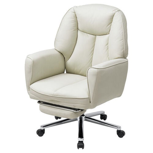 座面の下には、必要な時にサッと引き出して使える収納式オットマン(フットレスト)を備えています。足をまっすぐ伸ばして乗せることができるため、全身をリラックスさせたい時に大活躍します。使わない時は座面下にコンパクトに収納できるため、普段のデスクワークの邪魔にならず、見た目もすっきりスマートです。