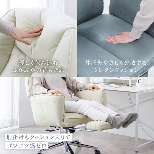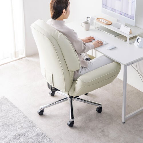 座面や背もたれには、弾力性のあるウレタンフォームを使用した肉厚クッションをたっぷりと採用しています。長時間のデスクワークでも疲れにくく、まるでソファに座っているかのような安心感のある座り心地を実現しました。頭までしっかり支える十分な高さがあり、体全体をやさしくしっかりと受け止めます。