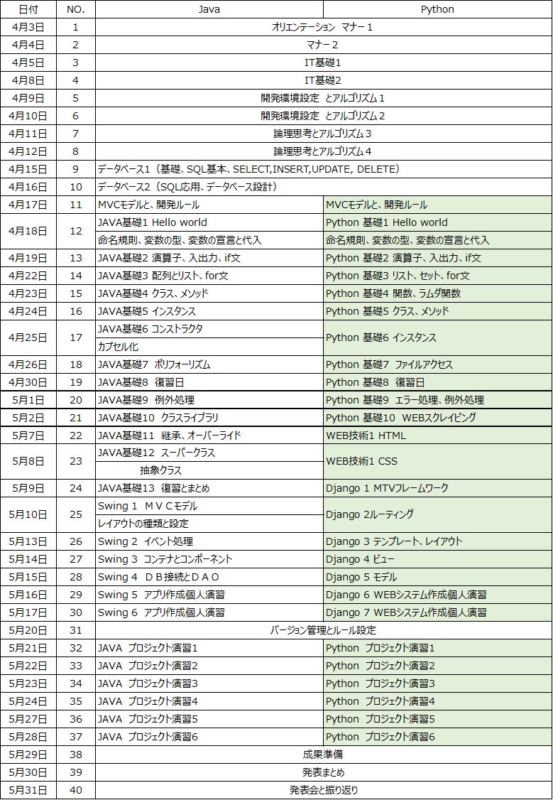 そこで本研修は、ITエンジニアとして第一歩を踏み出す新入社員を対象に、需要の高いプログラミング言語「Java」「Python」と併せて、社会人へのマインドチェンジなど基礎研修を学び、「テクニカルスキル」と「ヒューマンスキル」をセットで習得できるカリキュラムになっています。