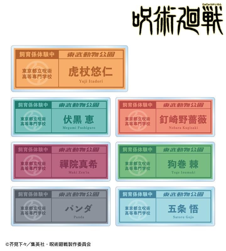 虎杖悠仁、伏黒 恵、釘崎野薔薇、禪院真希、狗巻 棘、パンダ、五条 悟の名前をネームプレートに仕上げました。