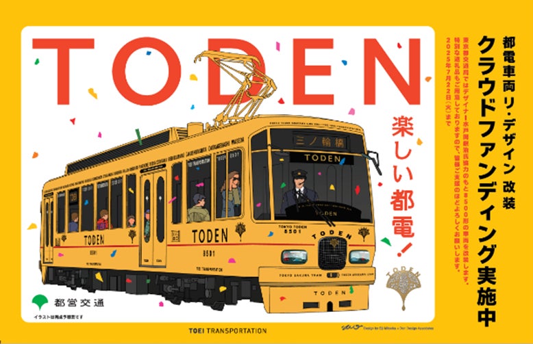 都電の更なる魅力向上と沿線地域の活性化を図るため、長年使われてきた車両1両を、特別なデザインにリニューアルするプロジェクトを始動しました。本プロジェクトの実施に当たっては、数多くの車両デザインを手掛けられているデザイナー・イラストレーター水戸岡鋭治氏にデザイン協力をいただくとともに、この特別な車両の運行を皆様と共に実現したく、都営交通初のクラウドファンディングを令和7年7月22日(火)まで実施しています。