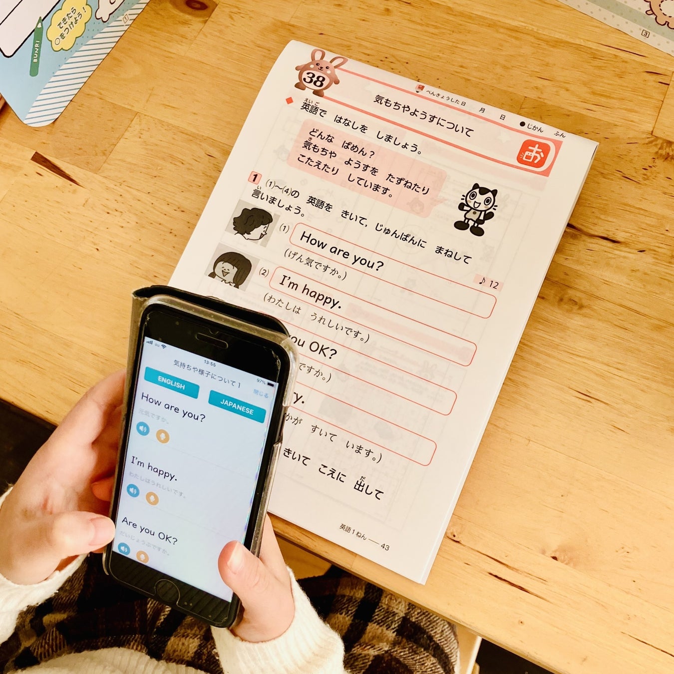 「おん達」は「小学教科書ワーク 英語」の付録アプリ。ネイティブのお手本を聞き、スマホに向かって発音すると、AIが発音を採点!