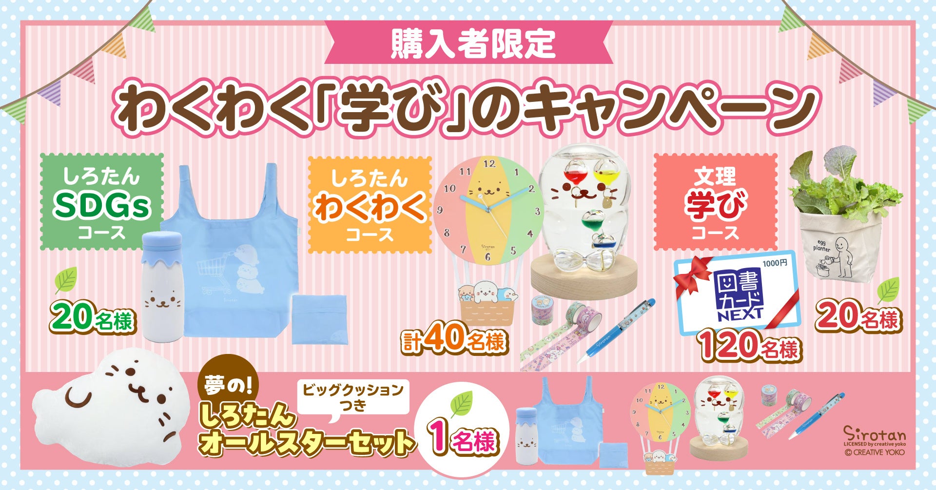 新学期限定の豪華キャンペーンは、セットに登場するキャラクター「しろたん」のグッズや、SDGsを実践できるグッズ、学習に役立つグッズなど幅広いアイテムをご用意!