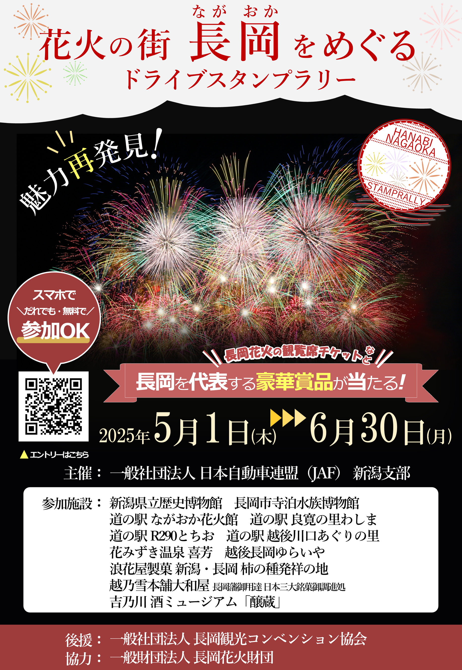 一般社団法人日本自動車連盟(JAF)新潟支部(支部長・町田 一越)は、5月1日(木)から6月30日(月)までの間、スマートフォンを使用し、新潟県長岡市にある11施設をめぐる「魅力再発見!花火の街長岡をめぐるドライブスタンプラリー」を開催します。