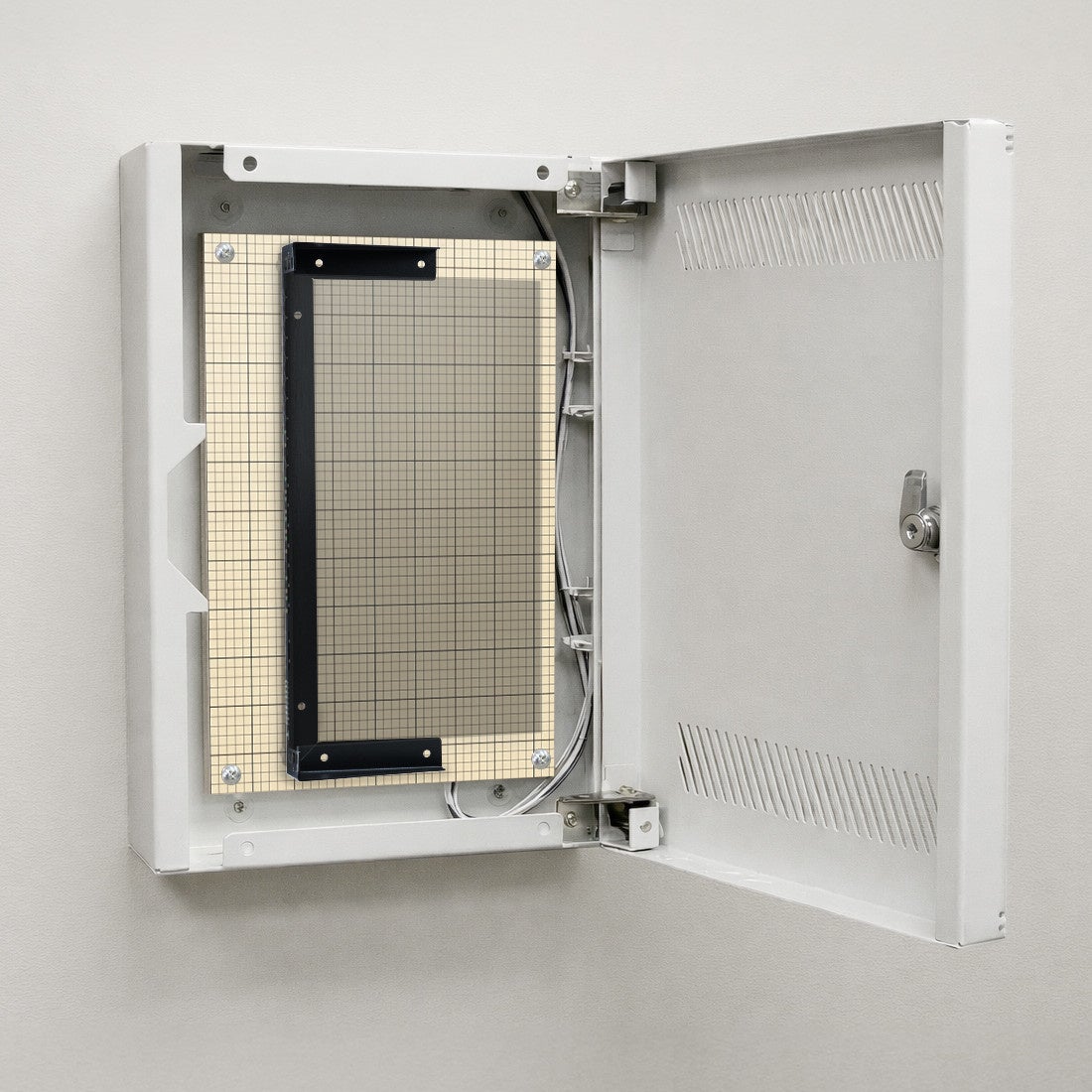 通信用ボックス内に取り付けられた木製基板に設置でき、19インチ機器を任意の位置に固定することができます。