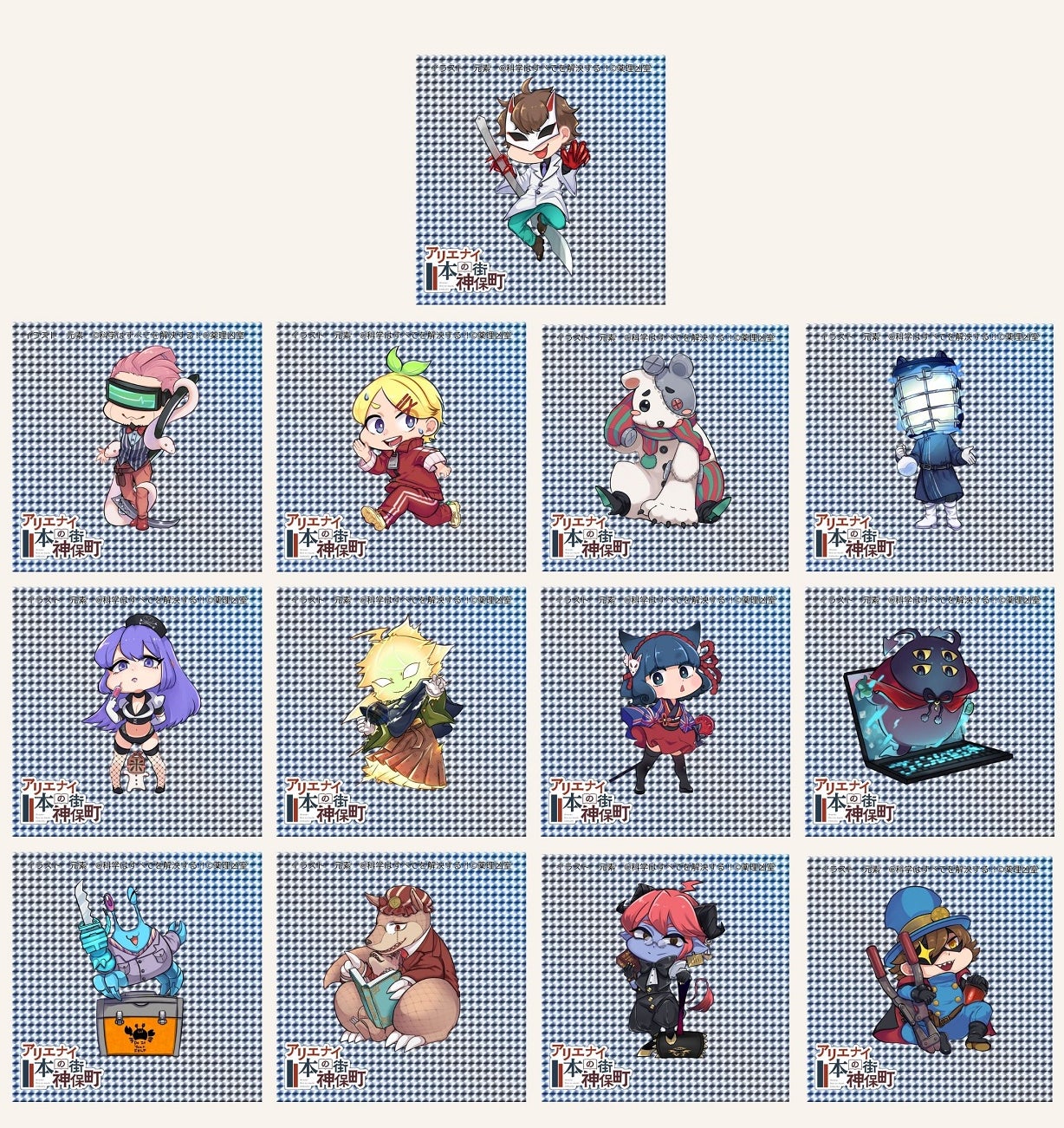 くがほたる先生絵による、薬理凶室怪人とアリエナイ本の街神保町スタンプラリーの参加店舗のコラボポストカードセットです。