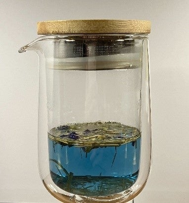 レモンを浮かべた透明カップにハーブティーを注ぐと、あら不思議、ブルーだったハーブティーがかわいい紫がかったピンクに変わります。
