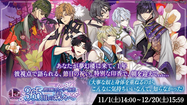 DMM GAMESを運営する合同会社EXNOA(本社:東京都港区、CEO:東條 寛、URL:https://games.dmm.com/)は、Romanteen18シリーズの第1弾・オトナの女性向け恋愛ゲーム「夢幻楼と眠れぬ蝶」にて「1st Anniversaryガチャ Part2」の開催と、Xにて1周年記念「第2回お部屋コンテスト」を開催することをお知らせいたします。また、「1st Anniversary彼目線ストーリー販売 365日目の蝶々へ」&「1st Anniversaryセット」を販売していることもお知らせいたします。