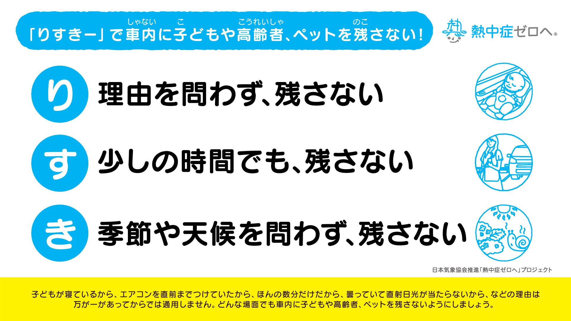 どんな場面でも車内に子どもや高齢者、ペットを残さないようにしましょう。数分で戻るから、直前までエアコンを入れていたから大丈夫などの油断は禁物です。