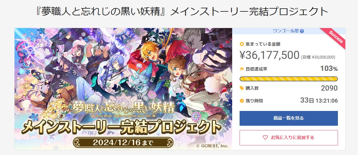 『夢職人と忘れじの黒い妖精』メインストーリー完結プロジェクト<3500万円>の目標達成!