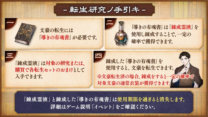 本イベントでは、イベント専用アイテム「錬成霊液」を使用し、一定の確率で獲得できる「導きの有魂書」を錬成することで「カフカ」を転生させることができます。この「錬成霊液」はイベント期間に実施される限定研究を達成すると報酬として獲得できるほか、購買にて限定セットを購入することでおまけとして入手することができます。