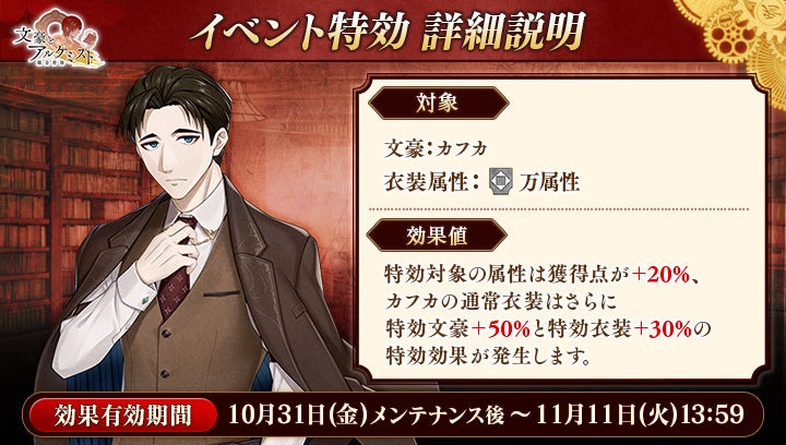 期間中「カフカ」の通常衣装を編成して潜書すると、特効文豪50%、特効衣装30%の特効効果が発動します。また、「万」属性の衣装を編成して潜書すると、得点の獲得数がそれぞれ20%上昇します。