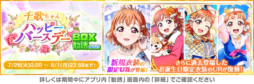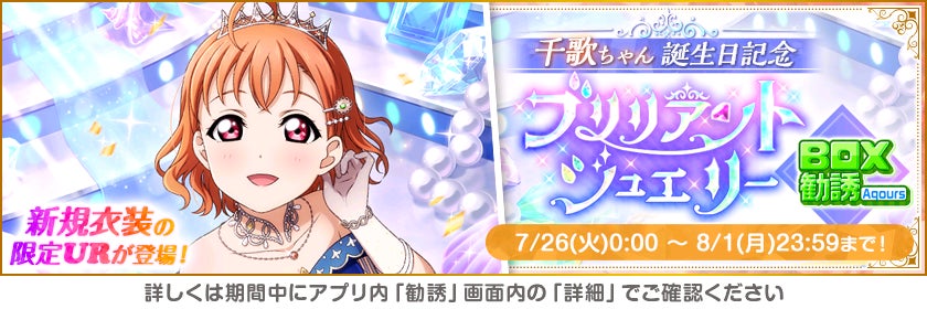 株式会社ブシロード(本社:東京都中野区、代表取締役社長:木谷高明)は、KLab株式会社(本社:東京都港区、代表取締役社長:森田英克)と共同開発いたしましたスマートフォン向けアプリ『ラブライブ!スクールアイドルフェスティバル』(以下、スクフェス) においてAqours高海千歌誕生日記念キャンペーンの開催をお知らせいたします。
