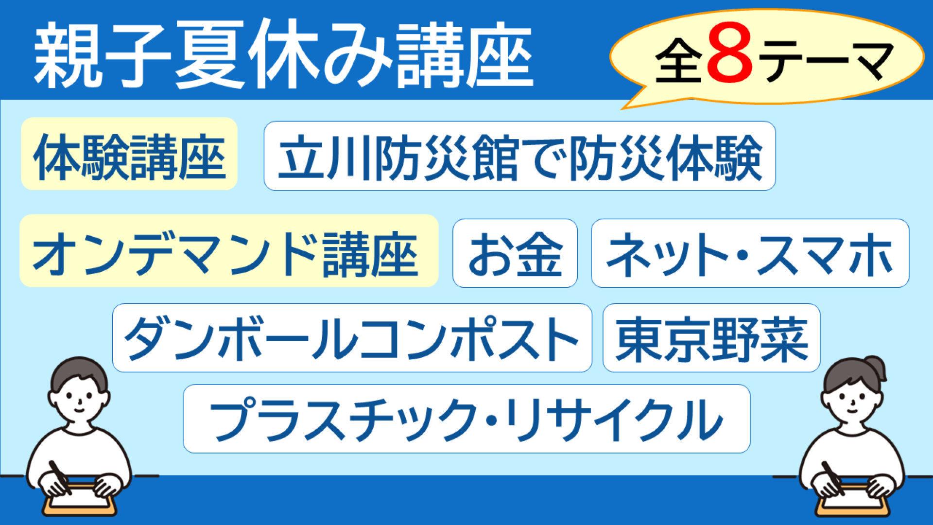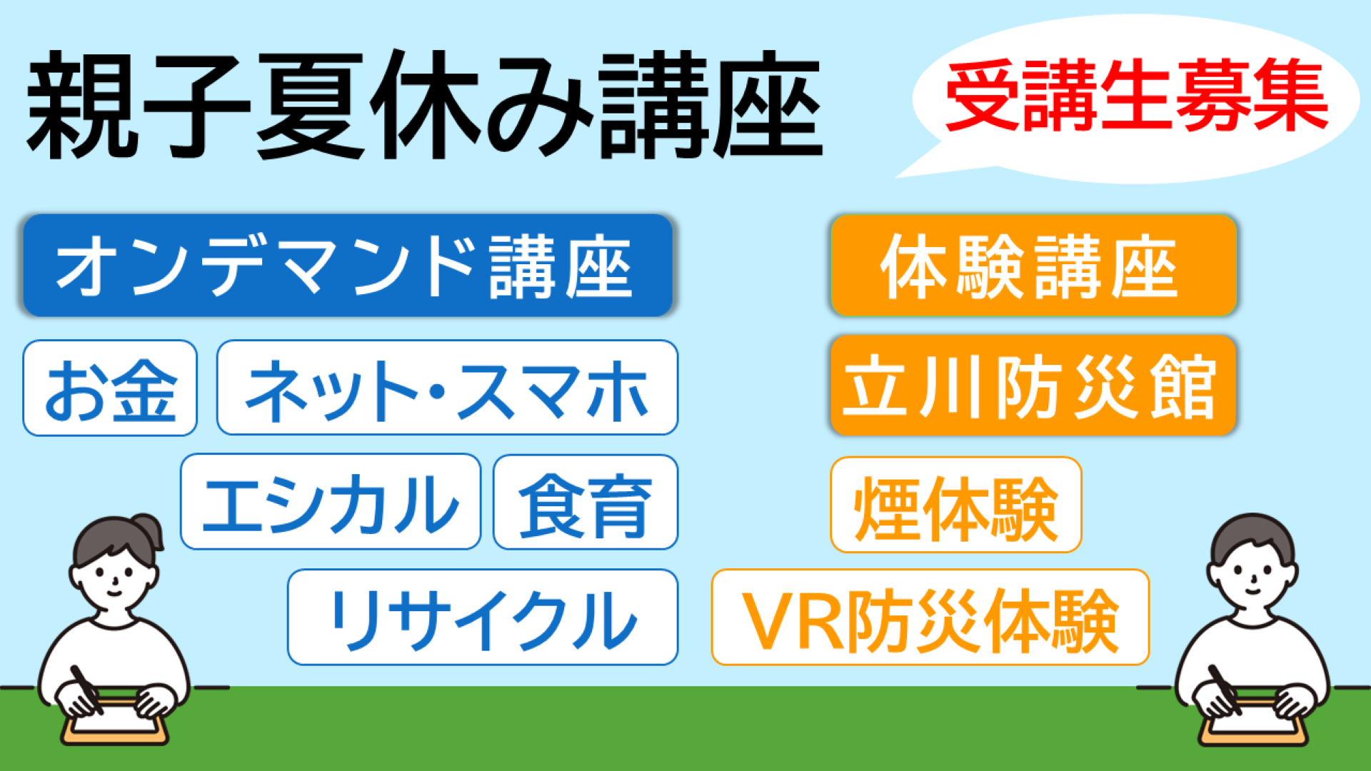 東京都多摩消費生活センターでは、子どもたちが早い段階から消費者としての基本的な知識とスキルを身につけられるように、夏休みを利用して、小学生とその保護者が消費生活について楽しく学べる講座を開催いたします。お金の使い方や、ネット、スマートフォンのマナーなど、学校では教わらないことを親子で「学び」「考える」貴重な機会となります。多彩なテーマを取り揃えておりますので、自由研究のヒント探しにもご活用いただけます。ぜひご応募いただけますようお願い申し上げます。