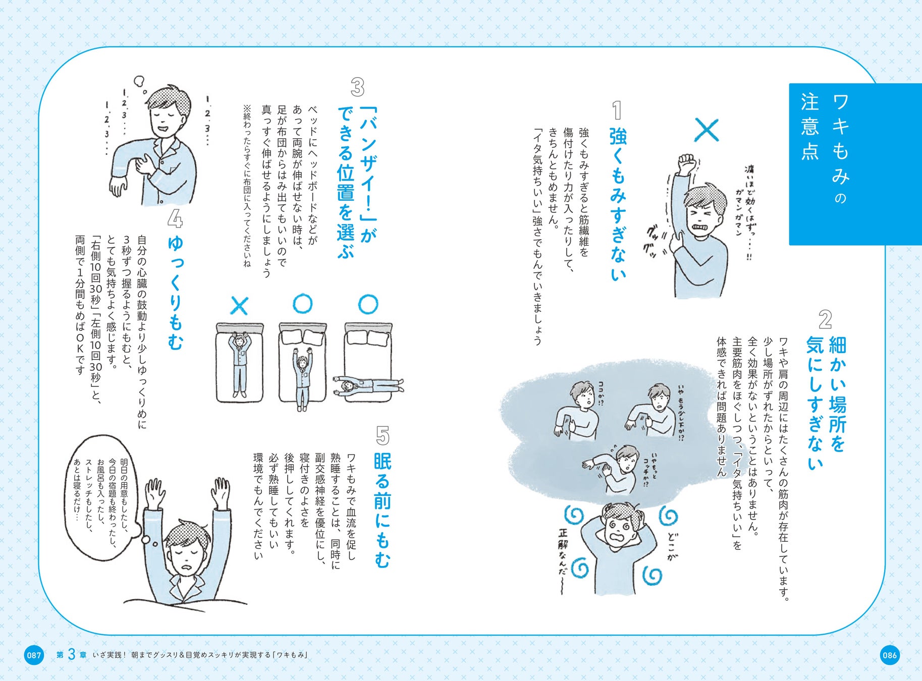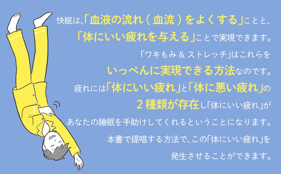 本書では、快眠するための「程よい疲れ」を生み出すストレッチを行った後、眠るためのスイッチをオンにするワキもみを行うという方法を提唱しています。