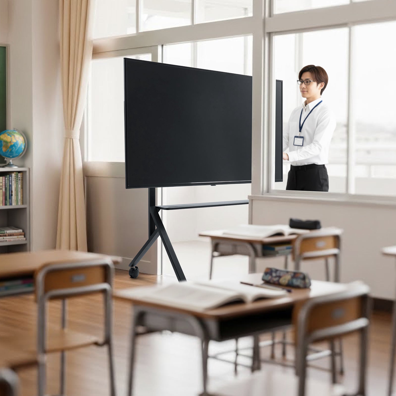 直径75mmの大型キャスターを採用し、重量のある大型ディスプレイでもスムーズに移動できます。4輪すべてにストッパーを備えているため、設置場所でしっかり固定することも可能です。会議室間の移動やセミナー会場での設置変更など、柔軟な運用をサポートします。