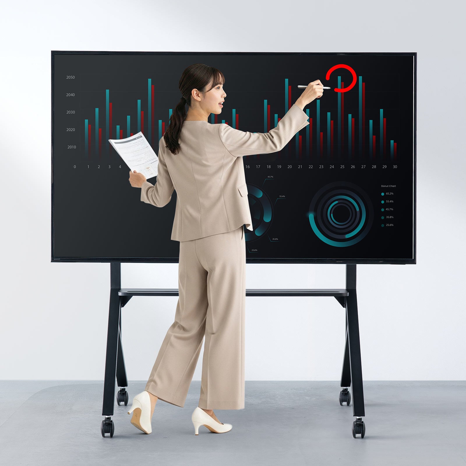 スタンドには便利な棚板を装備しており、ノートパソコンやプレゼン機器などを設置できます。さらにペントレーを備えているため、リモコンや筆記用具などの小物も整理しやすい設計です。機器周りをすっきりまとめることで、会議やプレゼンテーションをよりスマートに進められます。