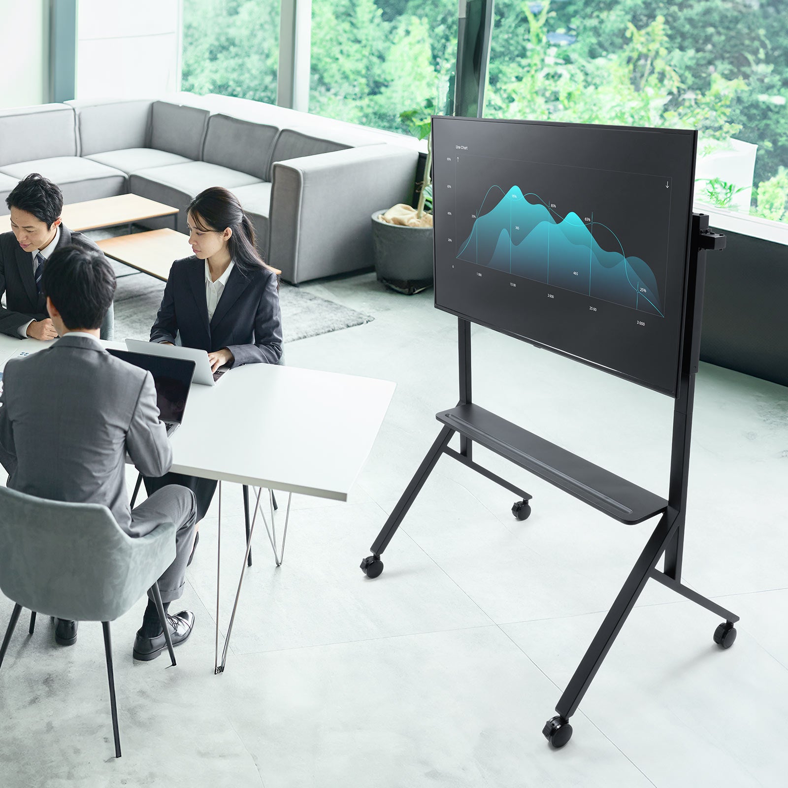 専用ハンドルによる手動昇降機構を採用しており、ディスプレイ中心高さを約125~150cmの範囲で調整できます。立った状態でのミーティングや、着席でのプレゼンテーションなど、使用シーンに合わせた高さ設定が可能です。昇降ハンドルは使用後に取り外して収納できるため、見た目もすっきりとした設置環境を保てます。