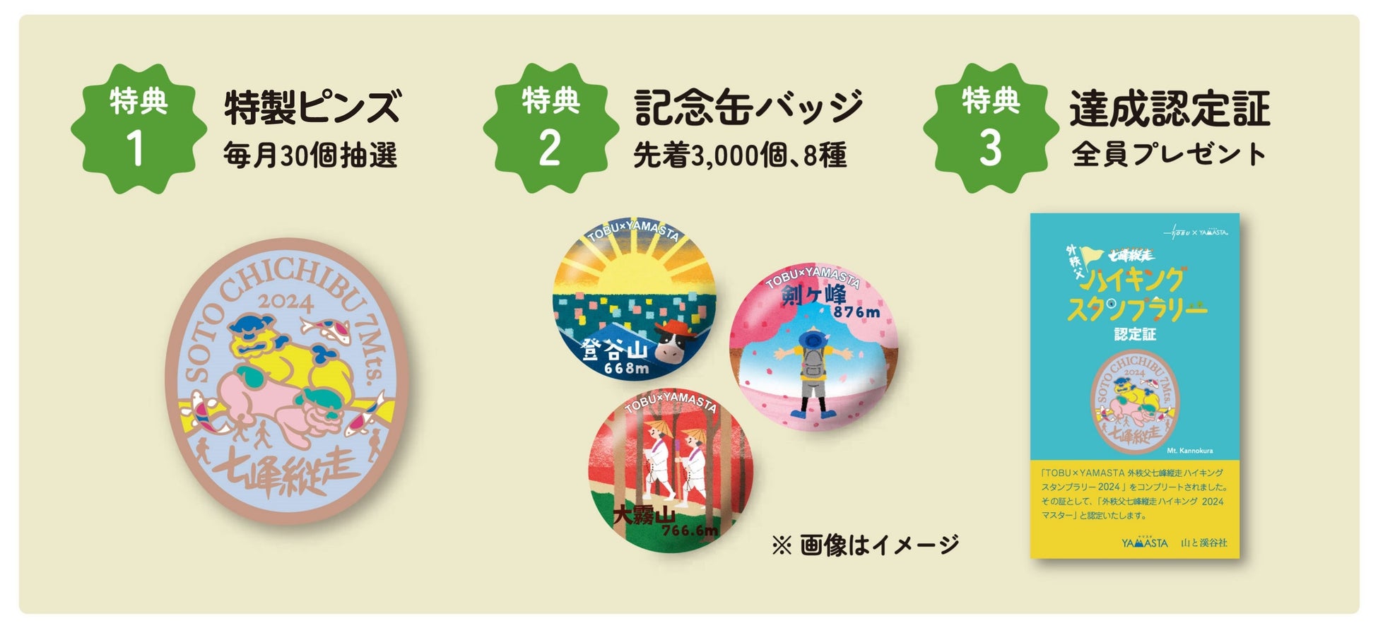 スタンプラリーコースを達成すると、記念缶バッジ(先着3,000個限定、8種)と達成認定証がもらえるほか、山のお土産ブランド「Yamasanka(ヤマサンカ)」とコラボした、人気の特製ピンズ(毎月30個抽選)に応募することができます。