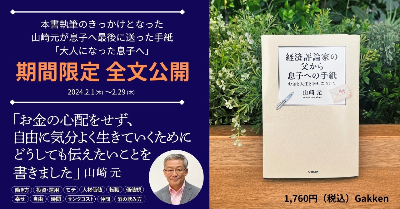 株式会社 学研ホールディングス(東京・品川/代表取締役社長:宮原博昭)のグループ会社、株式会社 Gakken(東京・品川/代表取締役社長:五郎丸徹)は、2024年2月15日(木)に『経済評論家の父から息子への手紙』(著:山崎元)を発売します。発売を記念して、本書発刊のきっかけとなった、山崎元さんが実際に息子へ送った手紙「大人になった息子へ」を、2月1日(木)から1か月間の期間限定で全文公開いたしました。