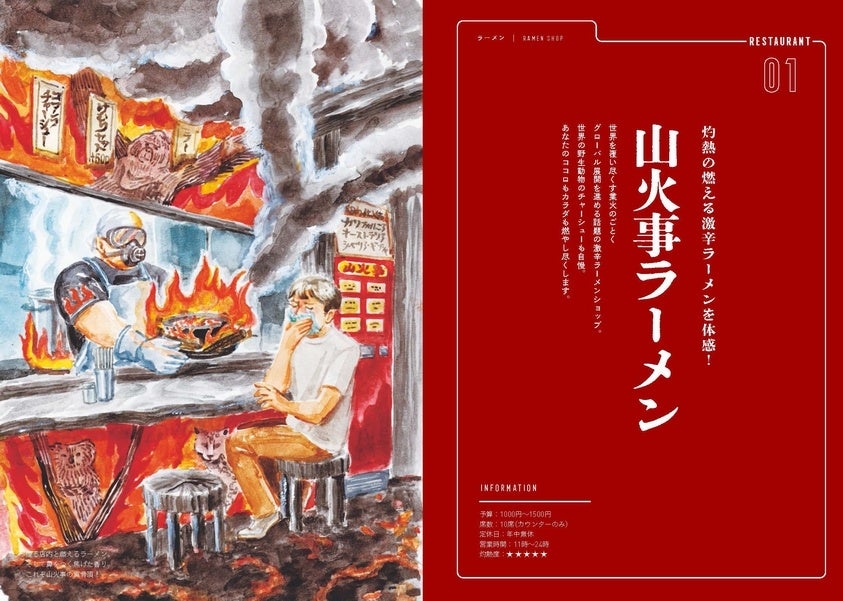 本書は、そんな環境問題を、誰もが関心があり身近に存在する「飲食店」を題材にして、ありえないような飲食店のガイドブックとして楽しみながら、シニカルに時にブラックに解説します。登場する奇天烈な飲食店はラーメン店から鮨処やホストクラブまで全13店。「こんな店、ありえない!」と思いながら、地球温暖化によるさまざまな問題から外来種、絶滅危惧生物問題、果ては陰謀論・フェイクニュースまで、環境問題を一通り知ることができます。レストランガイドのあとに、その環境問題の概略を学ぶことができる解説がそれぞれつきます。