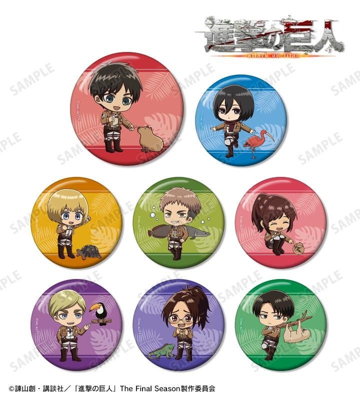 エレン、ミカサ、アルミン、ジャン、サシャ、エルヴィン、ハンジ、リヴァイのちびキャラを缶バッジに仕上げました。