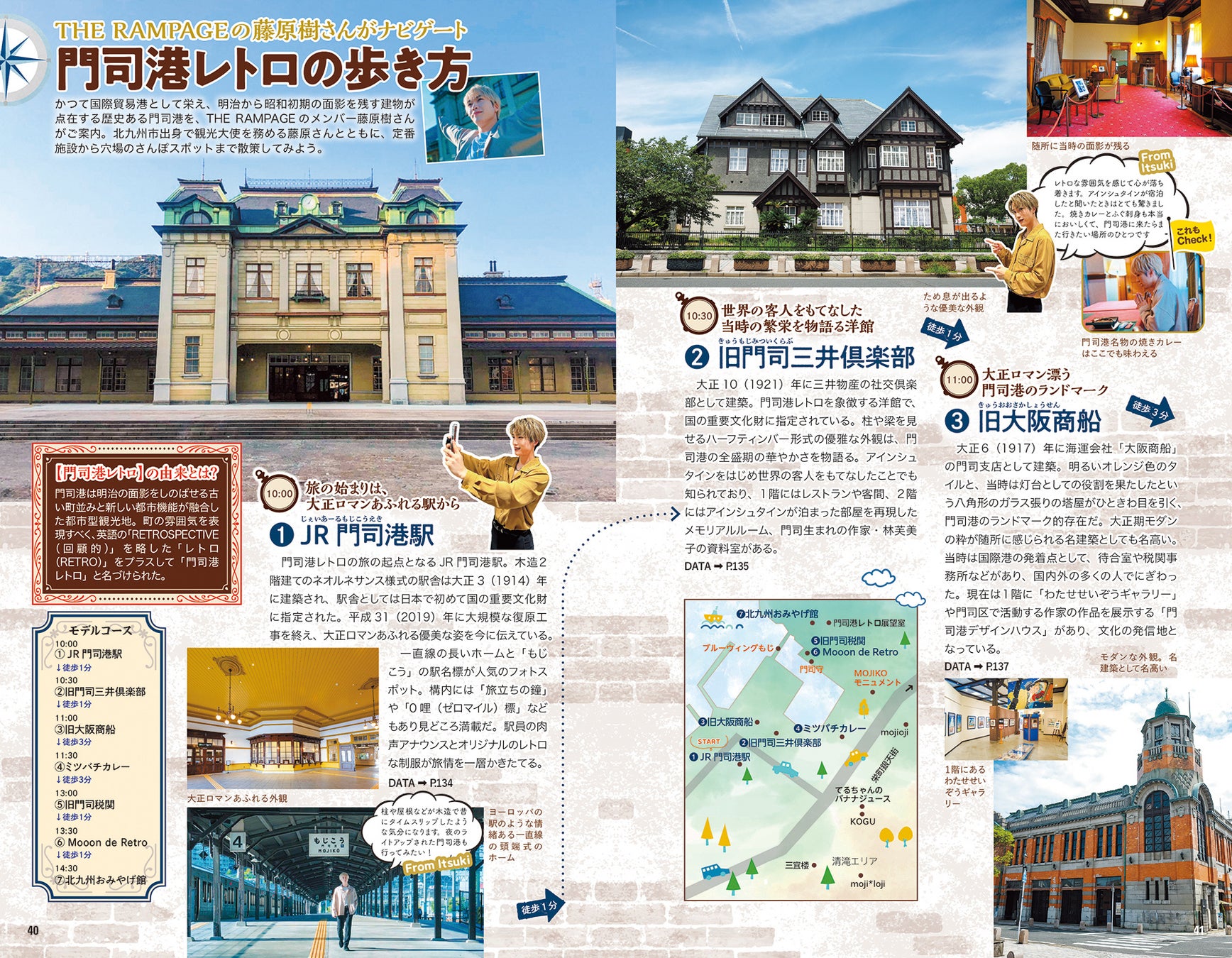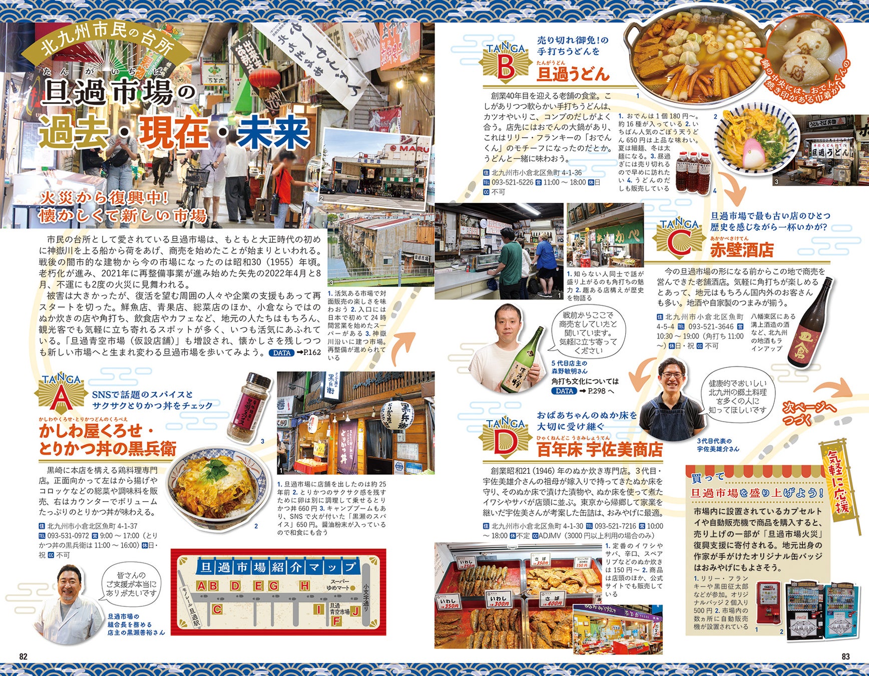 観光地として有名な門司港レトロは、観光大使を務めるTHE RAMPAGE 藤原樹さんがおすすめルートをご案内。定番観光地はもちろんのこと「地球の歩き方」らしく、その先にある昔ながらの商店街まで網羅しています。北九州市民の台所、旦過市場もイラストマップとともにおすすめをピックアップ!