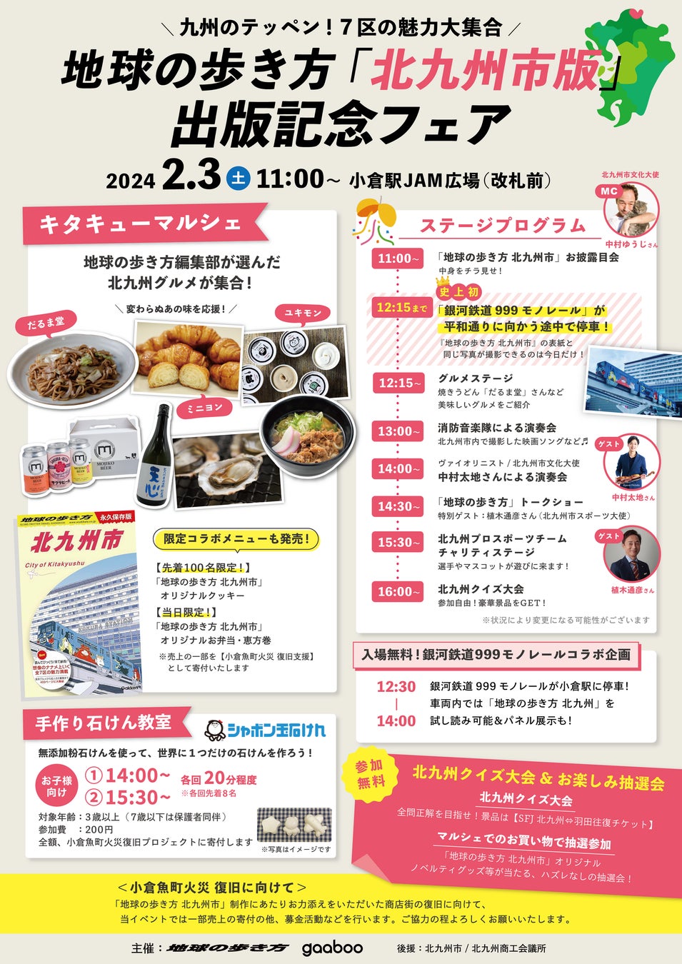 『地球の歩き方 北九州市』の出版を記念して、北九州市や『地球の歩き方 北九州市』のプロモーションを支援する(株)gaaboo(東京都渋谷区、代表取締役:辻正隆)との共催で2月3日(土)にJR小倉駅JAM広場でイベントを開催。7区の多彩なグルメメニューを販売するマルシェのほか、「地球の歩き方」編集室によるトークステージ、音楽ステージ、地域密着クイズ大会など盛りだくさんのプログラムでお届けします。