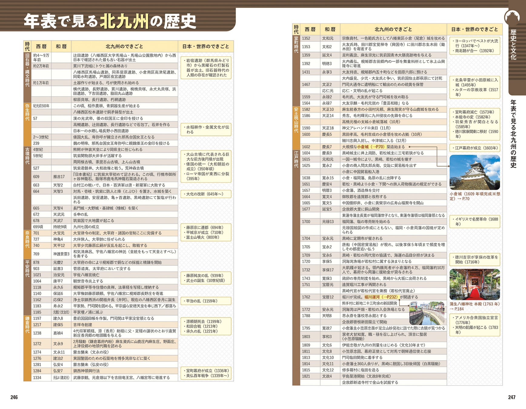 ガイドブックでありながらその土地を深く知るための歴史や文化の情報が充実している「地球の歩き方」。『北九州市』編では、ものづくりの歴史や北九州で生まれた角打ち※のお作法、話題のポップカルチャーに成人式まで幅広くカバー。北九州市の年表は旧石器時代から令和までを全8ページにわたって紹介しています。