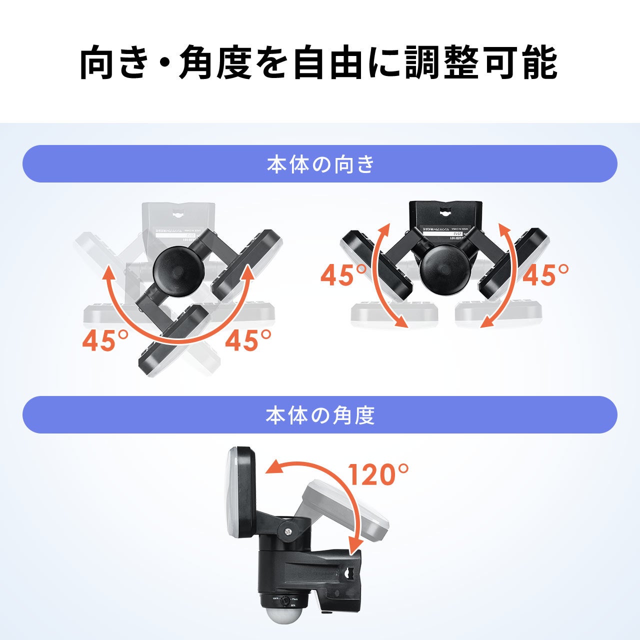 左右のライトとセンサーは可動式のため、照らしたい方向に合わせて角度調整が可能です。広く照らしたい玄関先から、狙った場所を照射したい通路や出入口まで、設置環境に合わせた使い方ができます。さらに、壁面へのネジ固定に加え、クランプでの設置にも対応。防水仕様で屋外でも使いやすく、家庭から店舗まで幅広いシーンで活躍します。