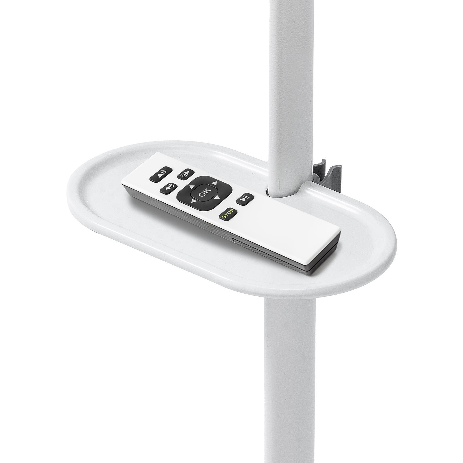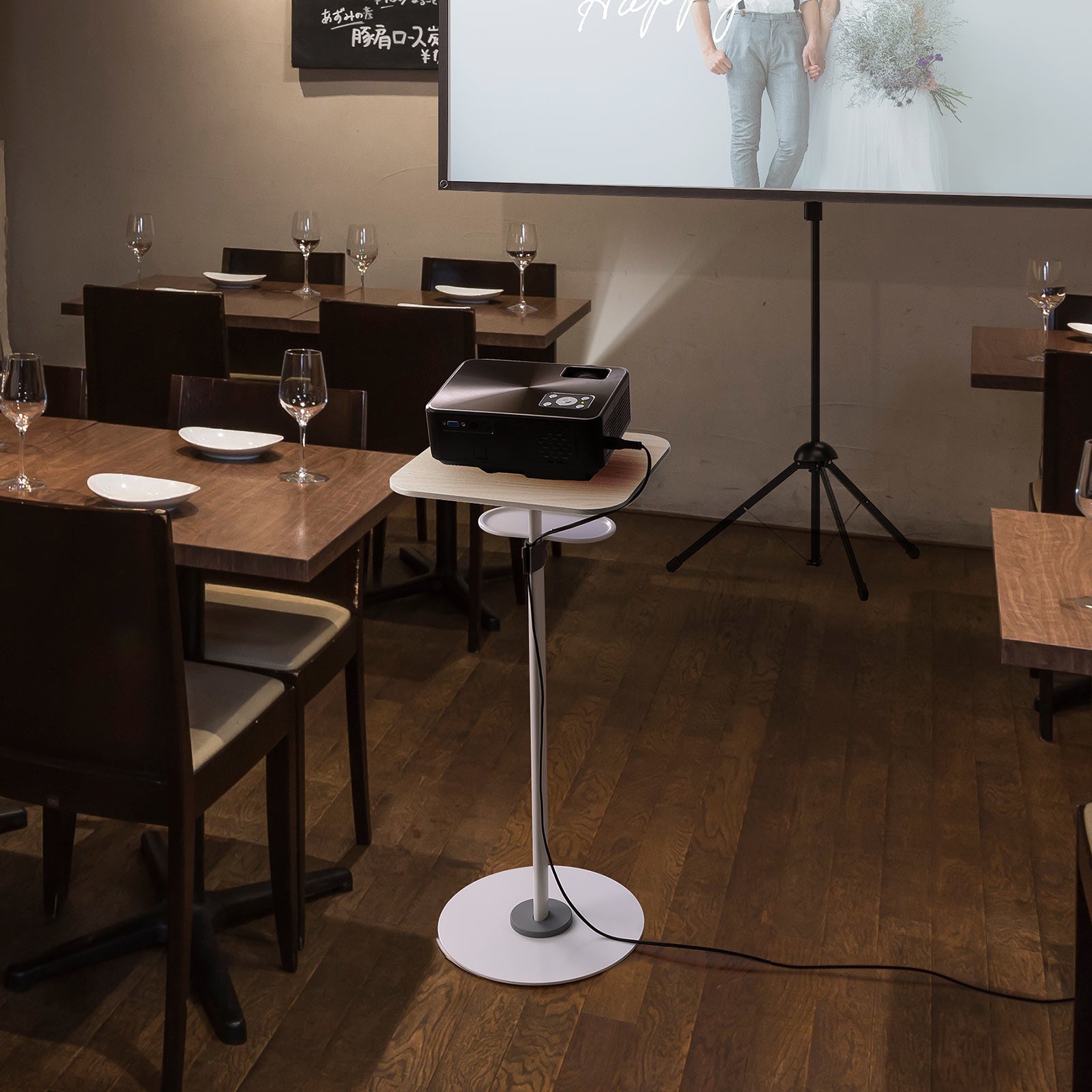 スタンドには小物を置けるトレイを搭載。リモコンやスマートフォン、ケーブルなどを手元にまとめて置くことができます。プレゼンや映画鑑賞中に必要なアイテムをすぐに取り出せるため、操作性や使い勝手を向上させます。