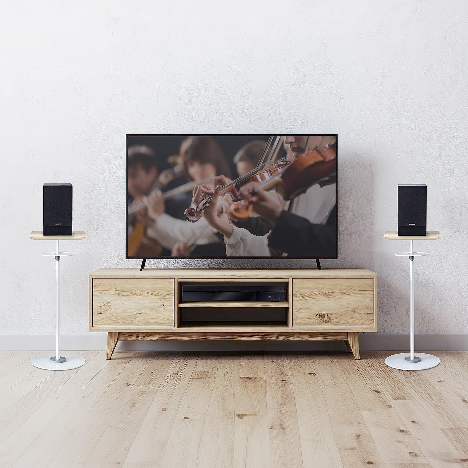 シンプルで使いやすいプロジェクタースタンド「100-PRST005シリーズ」に、インテリア性を高めた木目調天板モデルが新たに追加されました。ダークブラウン木目×ブラック、ライト木目×ホワイトの2カラー展開で、リビングやオフィスなどの空間にも自然になじむデザインです。機能性だけでなく、設置空間の雰囲気にもこだわりたい方におすすめのモデルです。