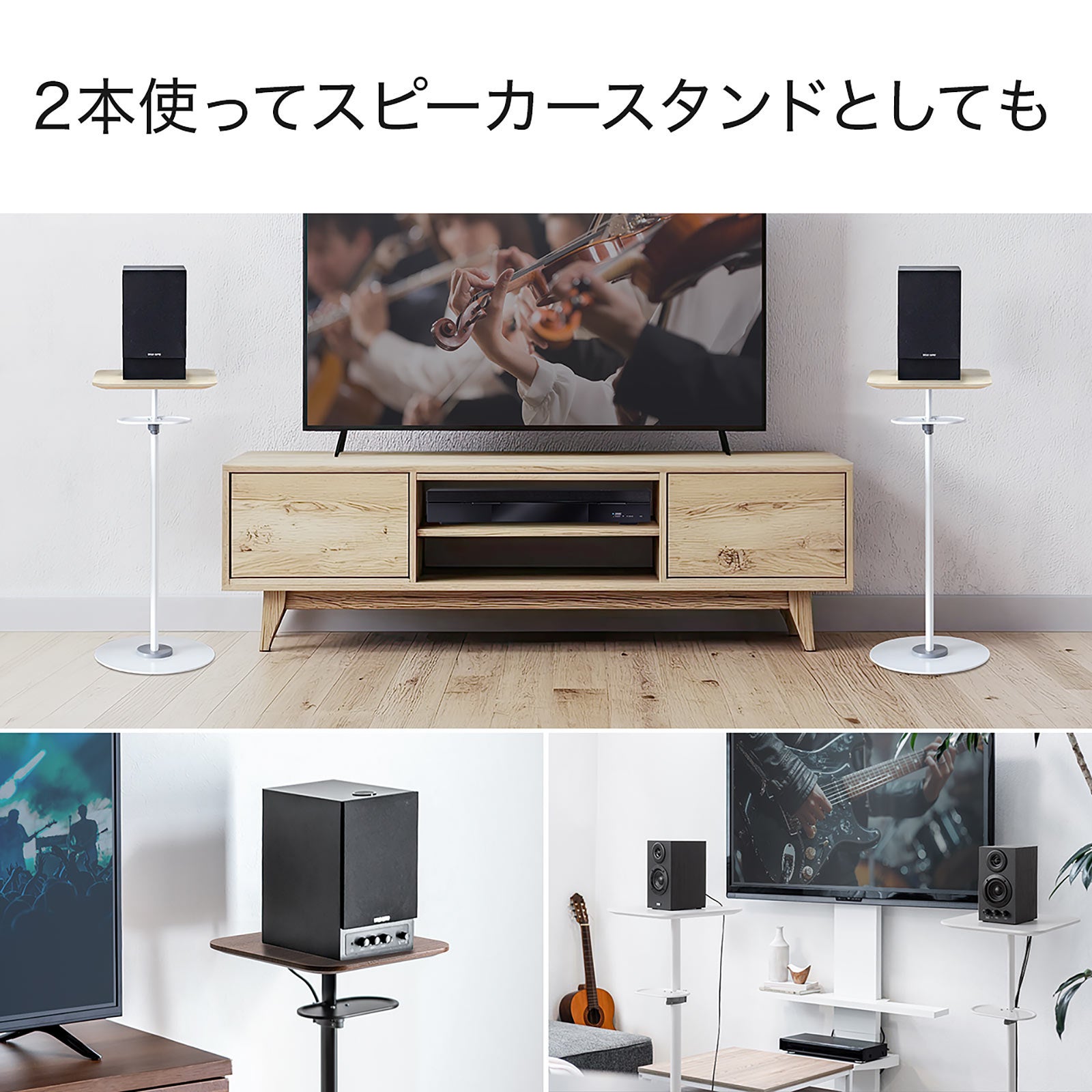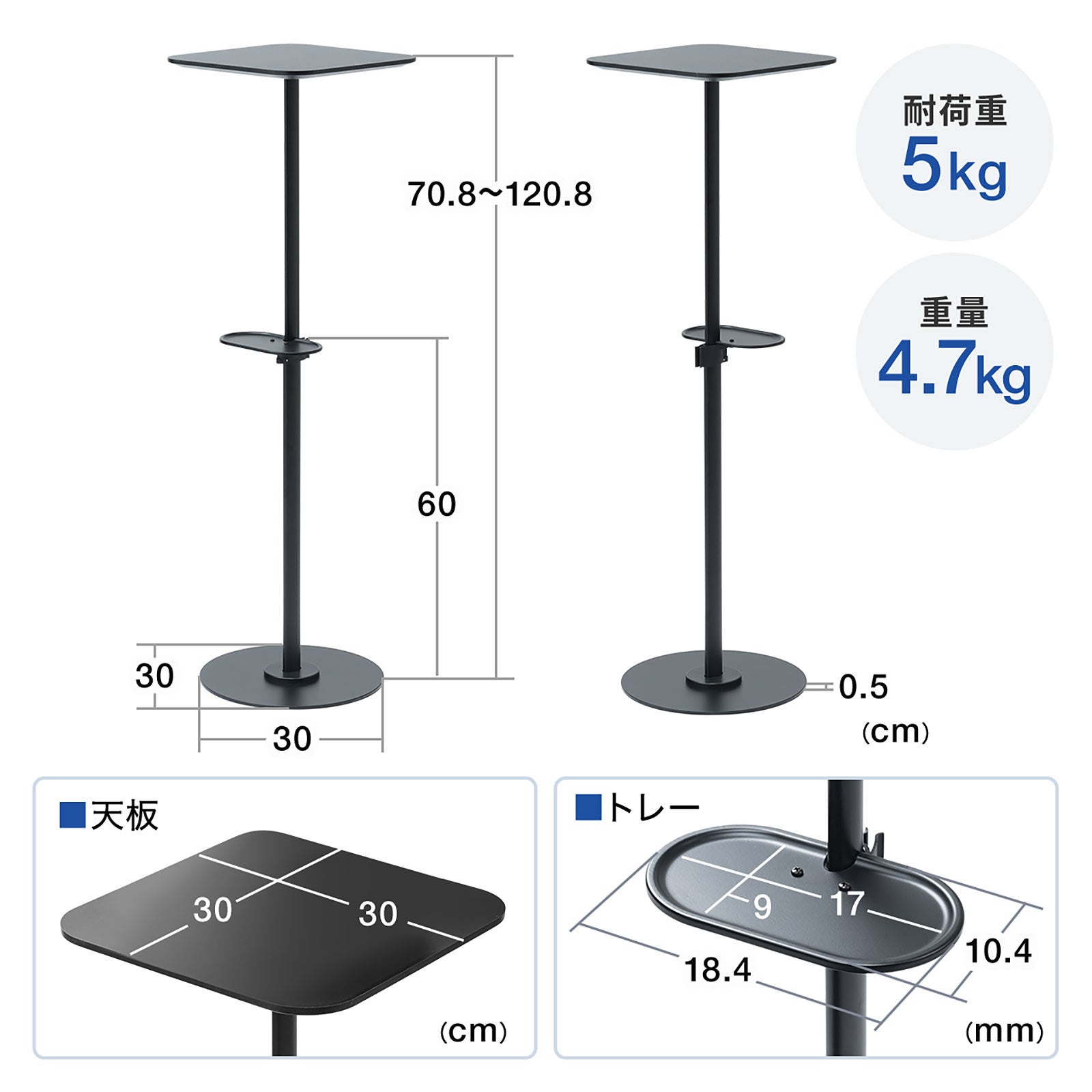 天板サイズは約30×30cmと、プロジェクターやビデオカメラなどをしっかり設置できるサイズ設計です。安定感のあるスチールフレームを採用しており、機器を安心して設置できます。シンプルなポールタイプのため、設置スペースを取りすぎず、さまざまな場所で活用できます。