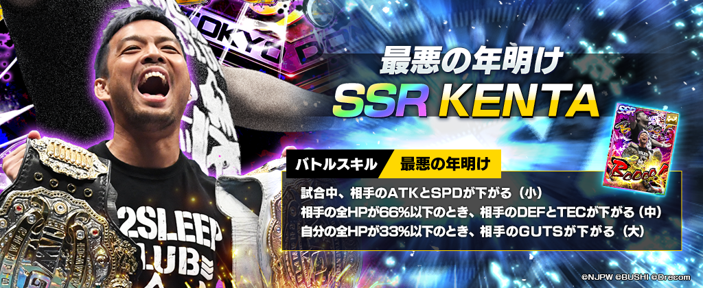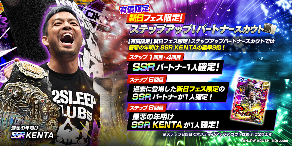 株式会社ブシロード(本社:東京都中野区、代表取締役社長:木谷高明)は、株式会社ドリコム(本社:東京都品川区、代表取締役社長:内藤 裕紀)と共同開発しているスマートフォンゲームアプリ『新日本プロレスSTRONG SPIRITS』(以下、新日SS)にて、フェス限定新★3選手「[ACE IS BACK]棚橋弘至」と新SSRパートナー「[最悪の年明け]KENTA」が初登場する各フェス限定ステップアップスカウトと次回イベントの参加先行受付を2022年7月27日(水)9:00からのメンテナンス終了後から開始した事をお知らせいたします。