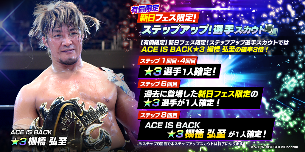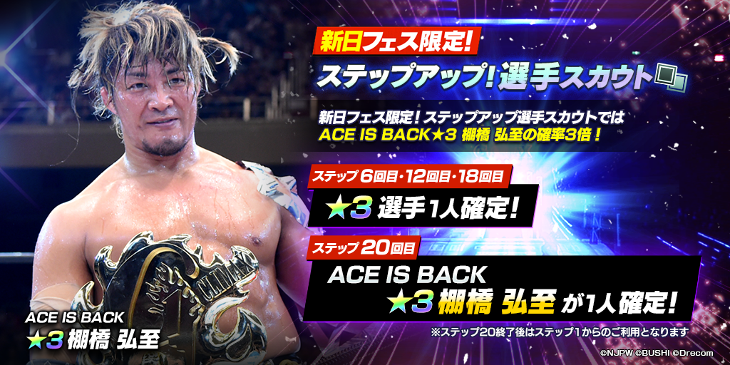- フェス限定新★3選手「[ACE IS BACK]棚橋弘至」が初登場のフェス限定ステップアップ選手スカウトを開催!