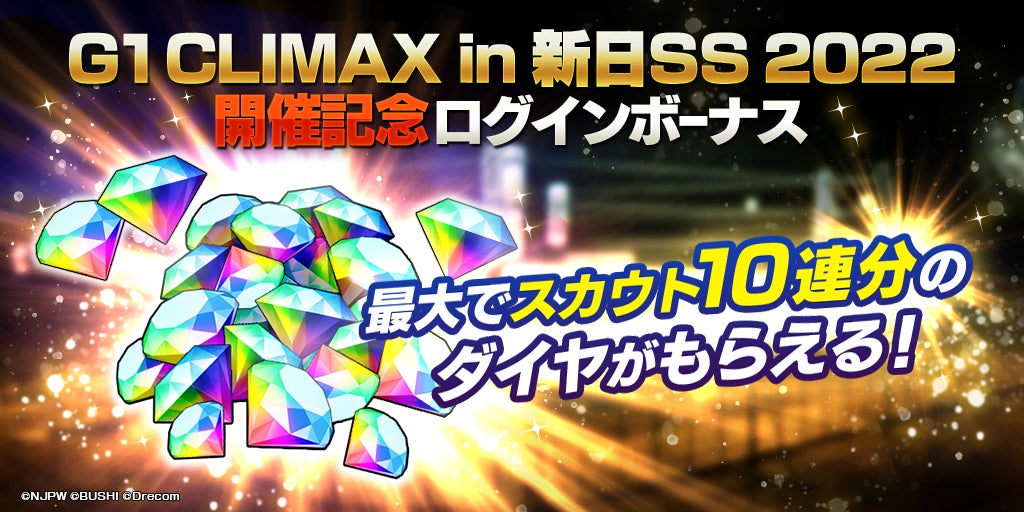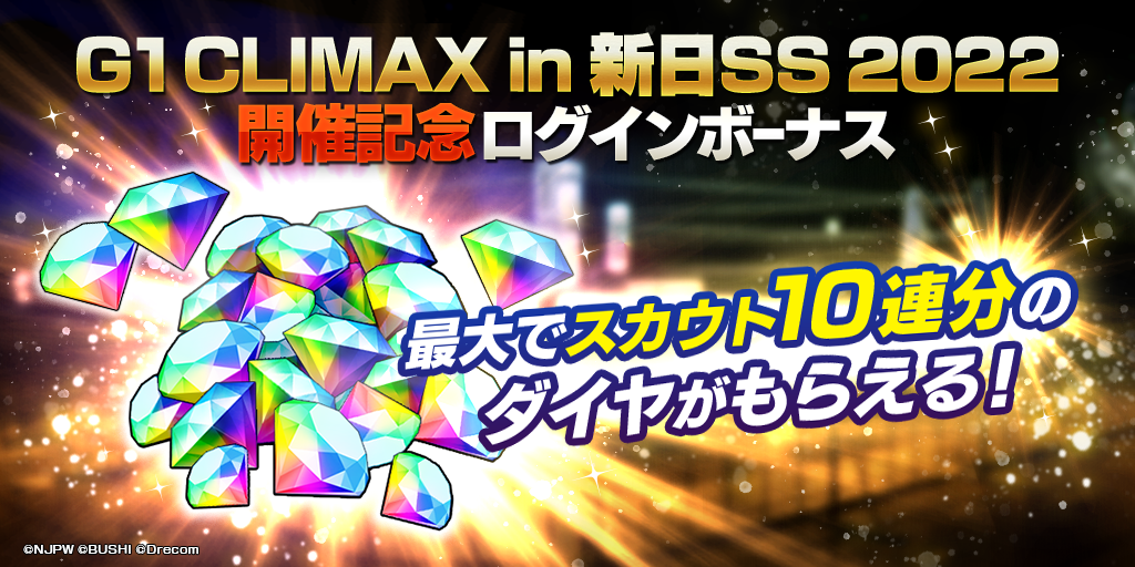 - G1 CLIMAX in 新日SS 2022開催記念として、最大1,500ダイヤ(10連スカウト1回分)が獲得できるログインボーナスを実施!
