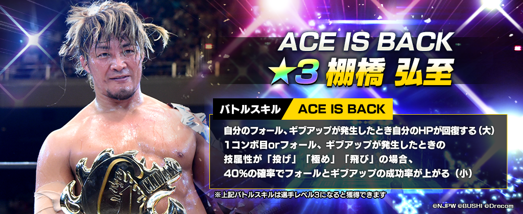 さらに初登場のフェス限定新★3選手「[ACE IS BACK]棚橋弘至」がピックアップ対象選手として、ステップアップ回数に関わらずスカウト確率が通常の3倍かつ獲得時のピース量が増量となっております。