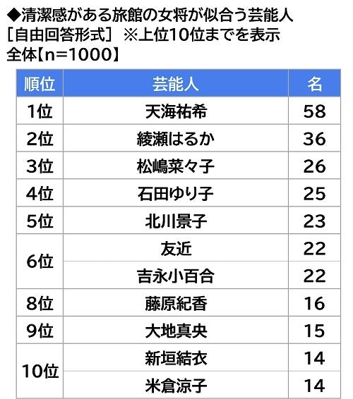 全回答者(1,000名)に、清潔感がある旅館の女将が似合う芸能人を聞いたところ、1位「天海 祐希さん」(58名)、2位「綾瀬 はるかさん」(36名)、3位「松嶋 菜々子さん」(26名)となりました。天海 祐希さんの凛とした佇まいが、清潔に保たれた旅館の女将のイメージにピッタリだと思う人が多いのではないでしょうか。