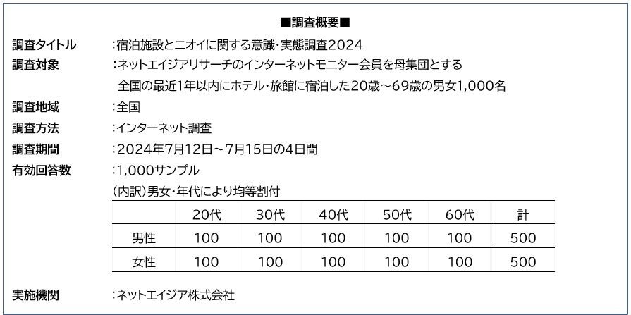 パナソニック株式会社 空質空調社(以下、パナソニック 空質空調社)は、2024年7月12日~7月15日の4日間、全国の最近1年以内にホテル・旅館に宿泊した20歳~69歳の男女を対象に、「宿泊施設とニオイに関する意識・実態調査2024」を実施し、1,000名の有効サンプルを集計しました。(調査協力機関:ネットエイジア株式会社)